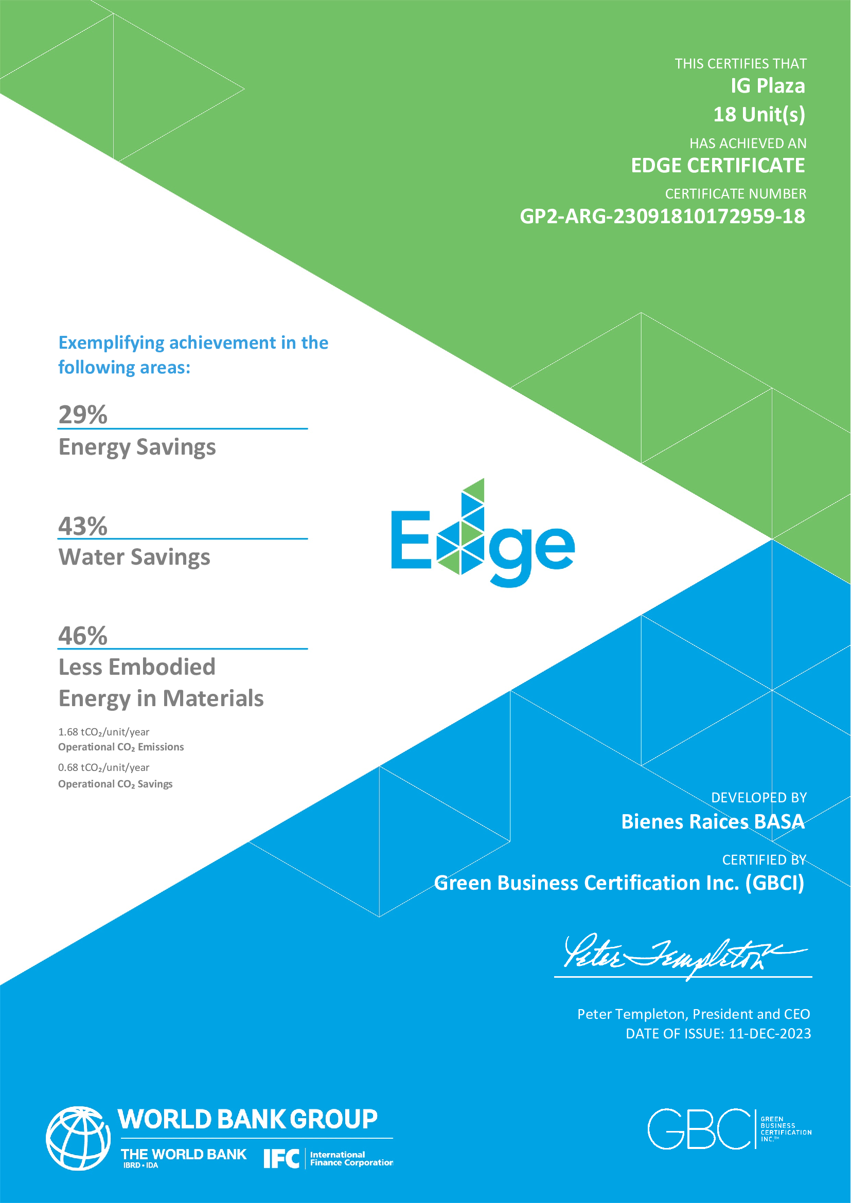 Durante su proceso constructivo, de cara a su inauguración final, el edificio ya cuenta con sus certificados EDGE tanto en diseño como su fase final, conseguido en diciembre de 2023.